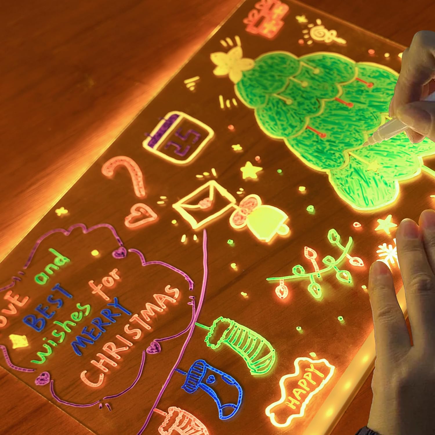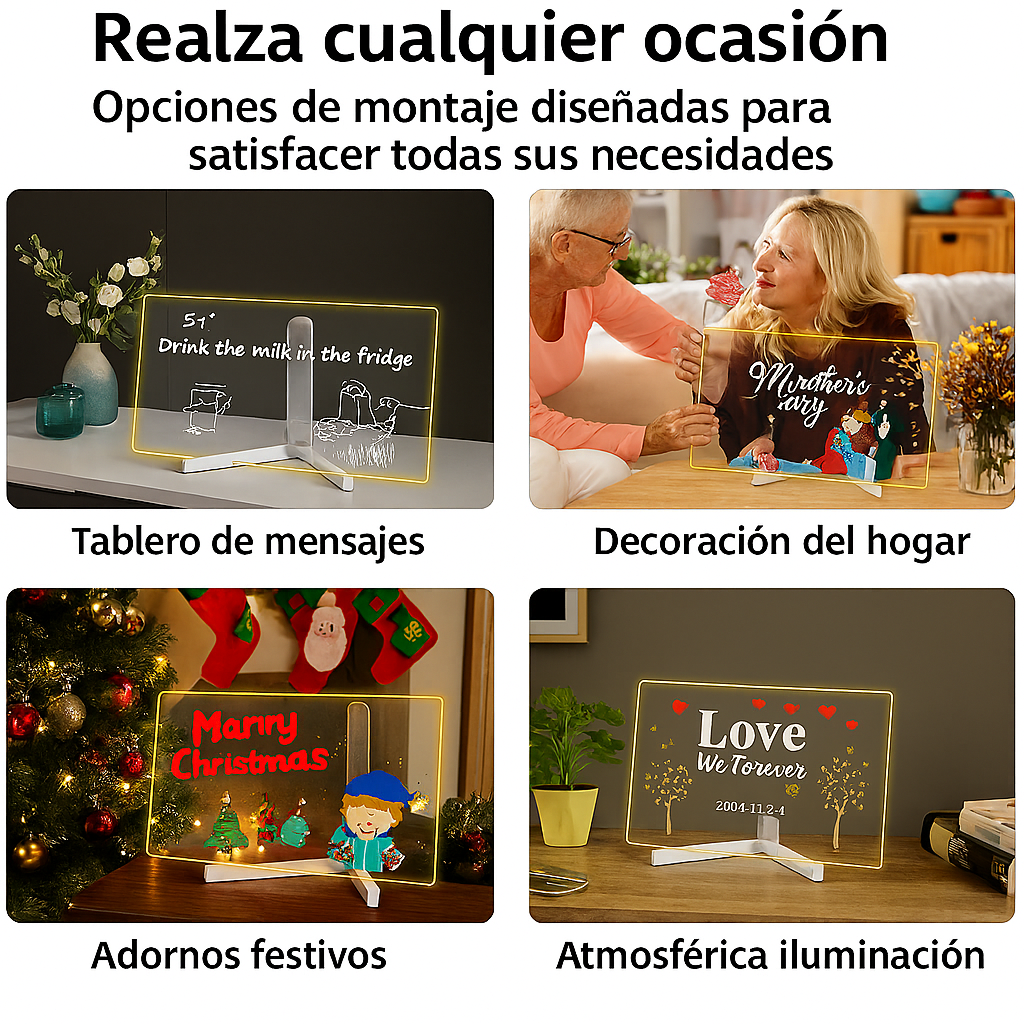 Ideal para niños y adultos, este tablero LED ofrece una manera interactiva y visual de expresar ideas, dibujar o dejar mensajes sin depender de teléfonos, tabletas ni computadoras. Al escribir o ilustrar sobre la superficie iluminada, se despierta la imaginación y se fomenta la concentración, la motricidad fina y el pensamiento creativo. Es perfecto para actividades artísticas, recordatorios inspiradores o simplemente para dejar volar la mente con trazos de colores brillantes. Además, promueve momentos de conexión familiar y aprendizaje libre de distracciones digitales.